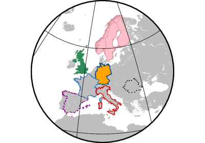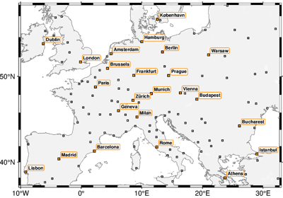 >>> import pygmt >>> # Create a new plot with pygmt.Figure() >>> fig = pygmt.Figure() >>> # Call the coast method for the plot >>> fig.coast( ... # Set the projection to Mercator, and the plot width to 10 centimeters ... projection="M10c", ... # Set the region of the plot ... region=[-10, 30, 30, 60], ... # Set the frame of the plot, here annotations and major ticks ... frame="a", ... # Set the color of the land to "darkgreen" ... land="darkgreen", ... # Set the color of the water to "lightblue" ... water="lightblue", ... # Draw national borders with a 1-point black line ... borders="1/1p,black", ... ) >>> # Show the plot >>> fig.show()